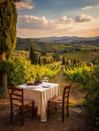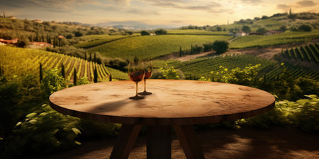 Scenic vineyard landscape with cheese platter and wine glasses