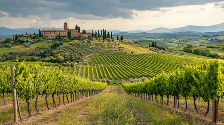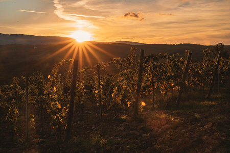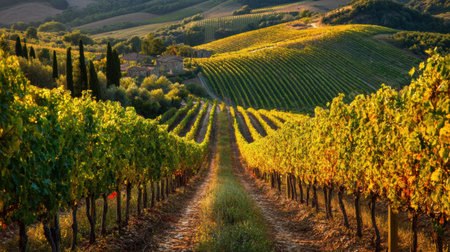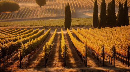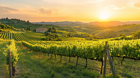 Golden hour sunlight bathes rolling rows of grapevines in a picturesque Tuscan vineyard. Idyllic Italian countryside landscape at sunset. Perfect for wine, travel, and agriculture themes.