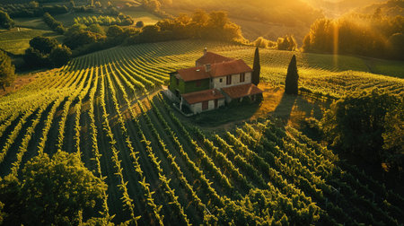 Sunrise Over Sprawling Vineyard: Top-Down View of Grapevines and Farmhouse in Golden Light