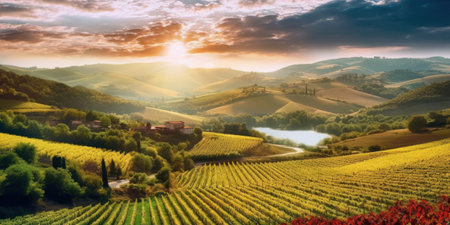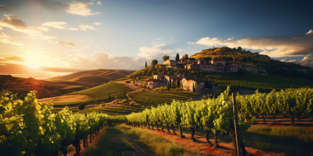 AI Generated. Stunning Vineyard Landscape at Sunset with Lush Green Hills