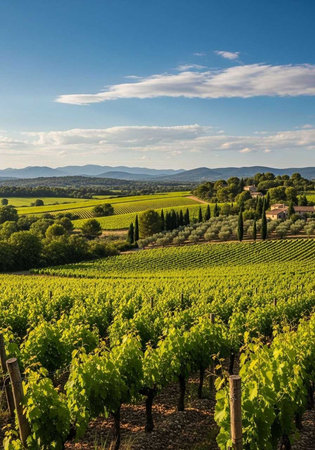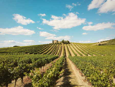 A serene vineyard landscape with rolling hills and a blue sky