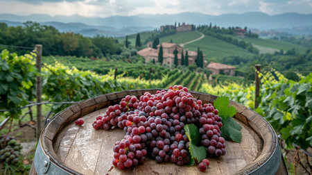 Cluster of red grapes on a barrel overlooking a lush vineyard in Tuscany. Tranquil atmosphere with rolling hills and traditional buildings in the background.