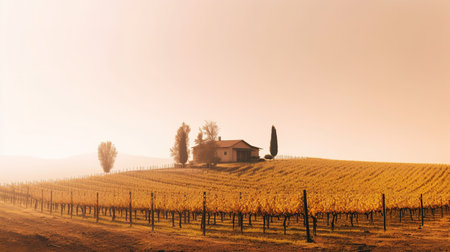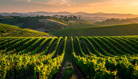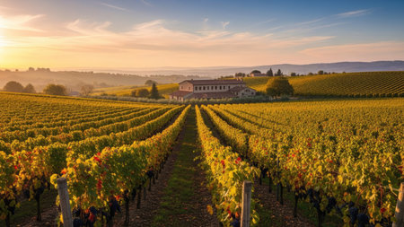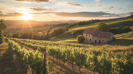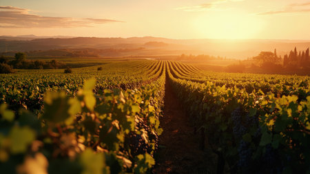 Serene sunset over rolling vineyard rows, bathed in the warm glow of golden hour. Picturesque landscape showcasing vibrant grapevines and idyllic wine country scenery. Perfect for wine label, travel brochure, or representing the harvest season.