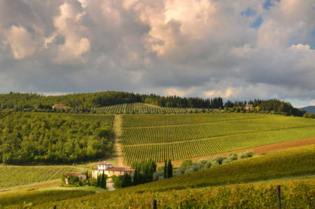 Beautiful vineyard in Tuscan countryside near Florence, cloudy sky. Italy.