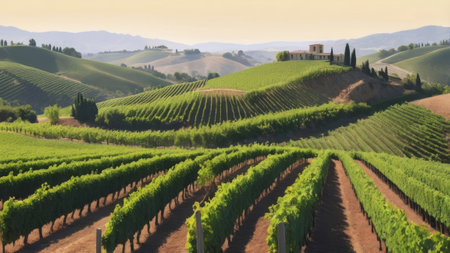 Scenic vineyard with grapevines and sunset light for wine and luxury lifestyle advertising. Rows of lush grapevines stretch across rolling (1)