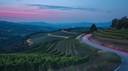 The winding roads through the vineyard are brought to life by the light trails of cars showcasing the beauty of the region and inviting drivers on a scenic journey