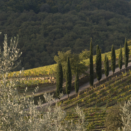 Landscape in Chianti region, vineyards and cypress trees. San Michele a Torri, Scandicci, Province of Florence, Tuscany region, Italy, Europe.