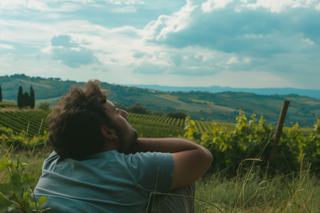 Man Relaxing in Scenic Vineyards with Rolling Hills and Cloudy Sky Background.