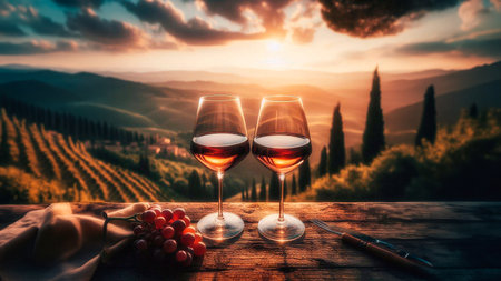 Two glasses of red wine on vineyard in Tuscany, Italy