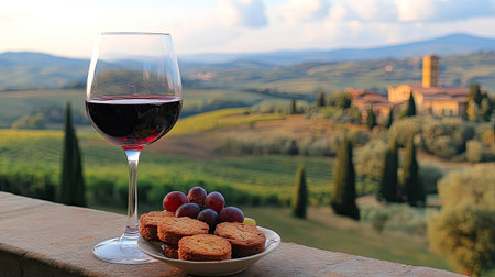 A close-up of a glass of red wine with Italian biscotti and fresh fruit, set against a blurred Tuscan landscape