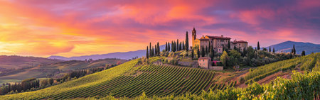 A vibrant sunset casts colorful hues over the Tuscan countryside, highlighting a historic villa surrounded by lush vineyards and rolling hills in Italy.