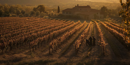Golden hour sunlight bathes a Tuscan farmhouse and vineyard in warm light, creating a serene countryside scene