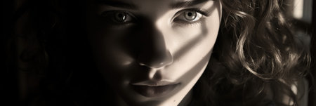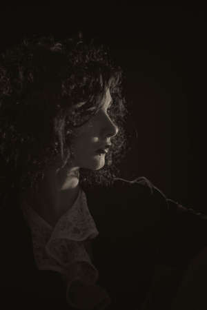 Artistic beautiful woman with long hair looking sexy. Shadow on half face. Closeup art portrait