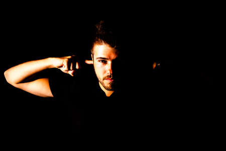 Portrait of a young man wearing a black T-shirt. A man in a black classic sweater on a black background. The dark-haired young man. An enigmatic look.