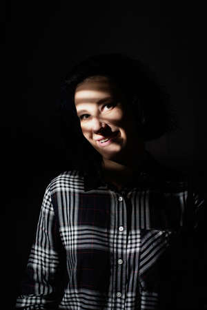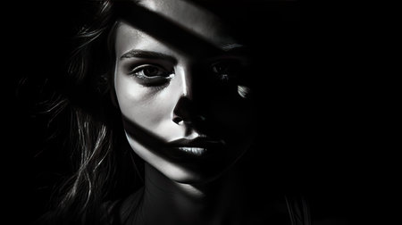 Woman in shadow. Female serious model with shadows on face looking seductive and sensual on dramatic black studio with light. Creative portraits with shadow and light over womans face, eyes on light.