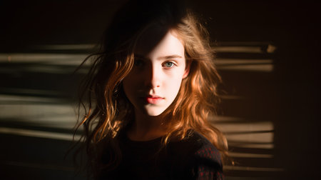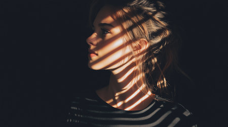 A young woman gazes thoughtfully as sunlight casts delicate shadows across her profile, creating a dramatic effect