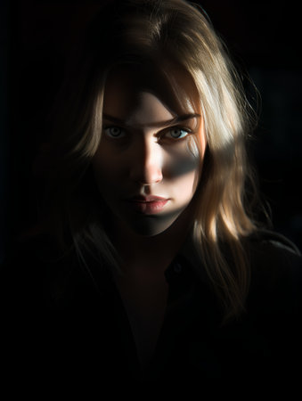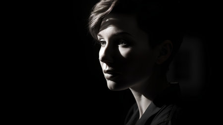 a woman in a black top gazes directly at the camera, illuminated by soft, atmospheric lighting. her elegant and emotive face captivates the viewer. this stunning portrait, taken with a canon eos 5d mark iv, showcases symmetrical asymmetry and graceful lines. with its chiaroscuro style, this captivating image has earned the title of contest winner. ai generated