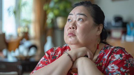 A young woman with long, dark hair looks thoughtfully into the distance against a blurred blue background.