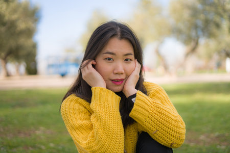pretty Asian woman in city park - lifestyle portrait of young beautiful and happy Korean girl sitting on green grass cheerful and relaxed enjoying free time outdoors