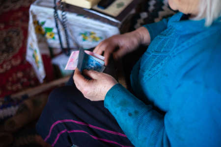 Old poor gray hair woman holds Ukrainian paper money in her hands. Woman is sad. Poor life in village. Old age not good. Low-light photo.