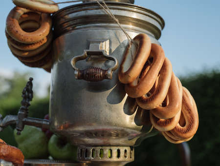 Russian vintage samovar for boiling water for tea. On the samovar hang a bundle of bagels.