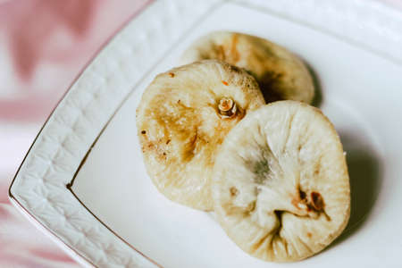 Dried dates on a gold saucer with a gold border on a silk tablecloth.