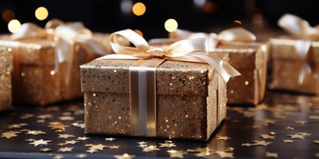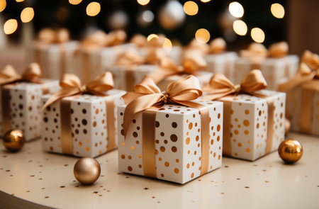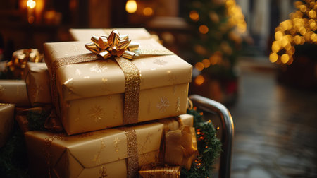 A stunning display of beautifully wrapped golden gifts on a wooden table, surrounded by a sparkling bokeh background that captures the essence of holiday celebrations.