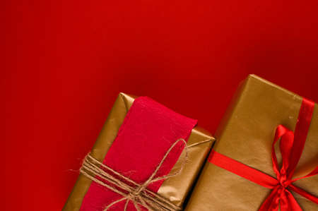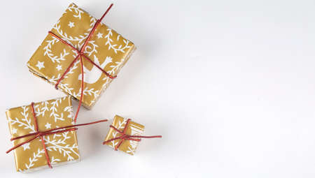 Golden gift boxes. Celebration, Christmas and branding. Packaging. Top view. Packaging design.