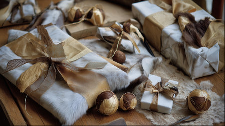 Decorative gifts are arranged carefully on a soft fur surface showcasing elegance with golden ties and natural elements perfect for a joyful celebration.