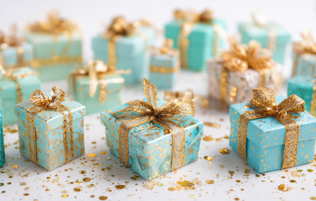 Turquoise gift boxes adorned with golden ribbons and glitter create a festive atmosphere. These beautifully wrapped presents are perfect for celebrations and special occasions. AI generated.