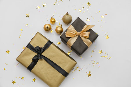 Various beautifully wrapped gifts in black and gold sit on a light surface, surrounded by decorative golden balls and star shapes, creating a festive holiday atmosphere..