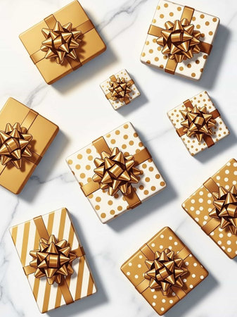 An overhead view displays various wrapped gift boxes and decorative ornaments. The composition features diverse textures and metallic accents, with gold and beige tones dominating. The image suggests a festive or celebratory context, offering potential use for promotional materials or design elements without any specific branding.