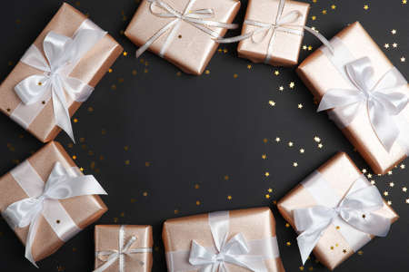 Christmas background. Golden gift boxes on slate background. Flat lay, top view