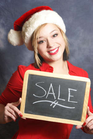 Santa woman holding colorful shopping bags with a sale discount t shirt