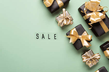 SALE text on Seafoam green paper background with black gift boxes and golden bow. Shopping Discount promotion.