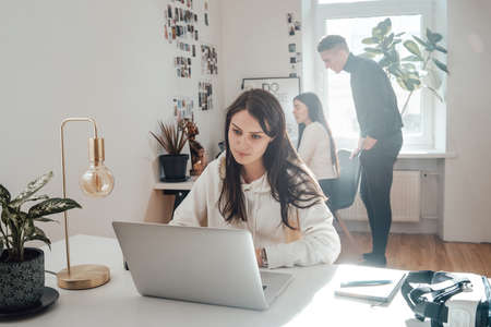 Portrait of serious female business person which types on laptop sitting at table in background of her coworkers and office.