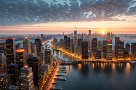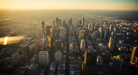 A breathtaking aerial view of a vibrant cityscape at sunset, with reflective skyscrapers and busy streets illuminating the scene as the sun sets on the horizon.