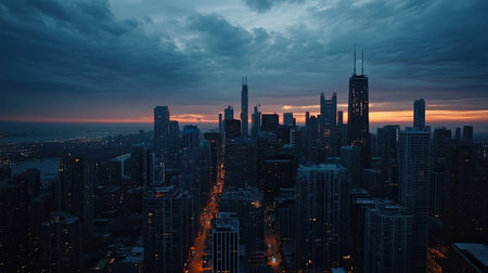 Cityscape of chicago at dusk with lights from the skyline. Generative AI