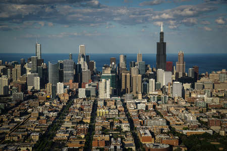 Chicago downtown aerial view with skyscrapers and lake Michigan, USA