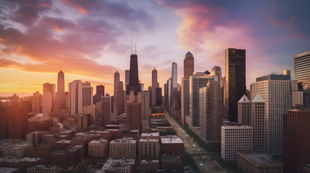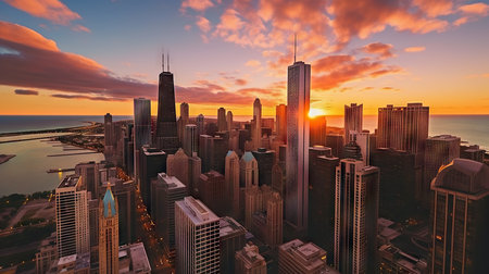 Aerial view of Chicago downtown skyline at sunset, Illinois, USA.