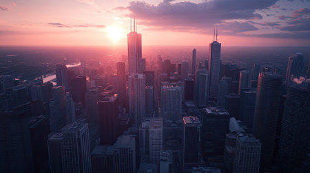 Aerial view of Chicago downtown skyline at sunset from high above.