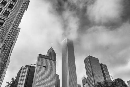 Chicago, Illinois. USA, Cityscape, spring day. City high rise buildings blue cloudy sky background, low angle view