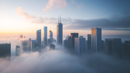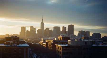 city skyline featuring modern skyscrapers, seen from an aerial view at sunset with no people visible