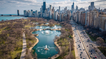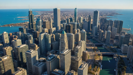A picturesque view of Downtown skyscrapers of Chicago skyline panorama over Lake Michigan at daytime, Chicago, Illinois, USA