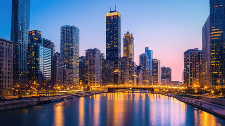 Stunning view of Chicago's urban skyline at dusk, showcasing illuminated buildings and reflections on the river. Ideal for travel and cityscape photography.