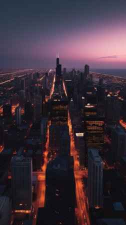 Aerial view of Chicago skyline at sunset, Illinois, USA.