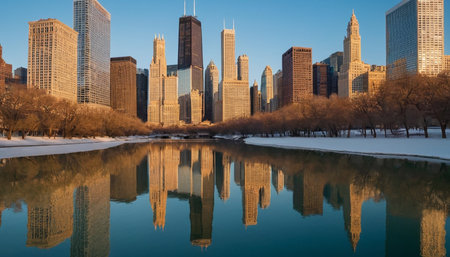 Downtown Chicago skyline with reflections on the Michigan lake. Early morning. Chicago, Illinois, United States.
