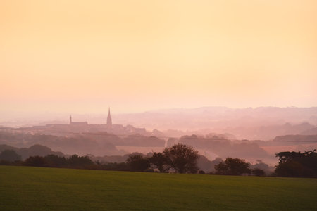 Trees, valley, old cathedral, houses and empty highway in a fog at sunrise. Panoramic aerial view, cityscape. Soft morning light. Picturesque scenery. Vacations in Brittany, France. Travel, tourism