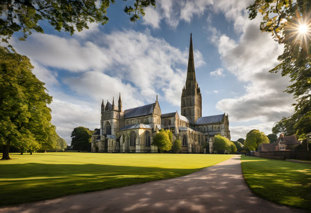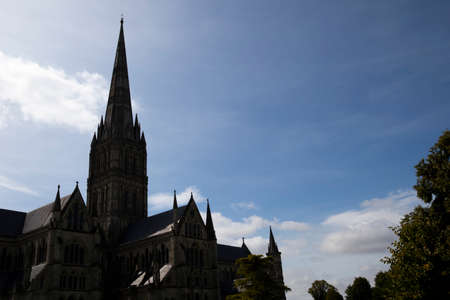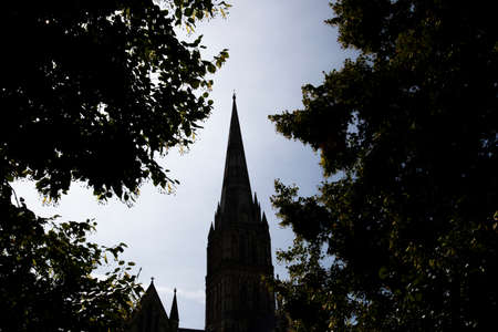 Salisbury Anglican medieval gothic Cathedral, formally known as the Cathedral Church of the Blessed Virgin Mary backlit by midday sun