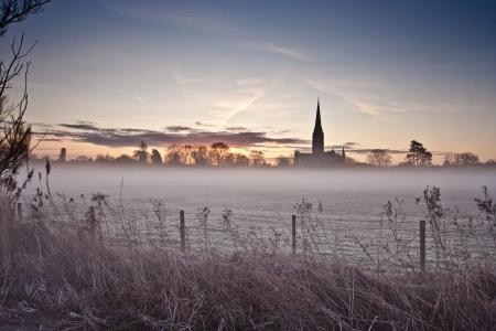 Salisbury cathedral and the west harnham water meadows in Wiltshire, England.